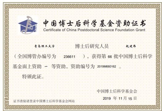 近日,中国博士后科学基金会公布了第66批博士后科学基金面上资助获得者名单。我校纽约国际上网导航青年教师赵建伟老师(合作导师孙英杰教授)获第66批中国博士后科学基金面上一等资助。在此次资助的环境科学与工程学科,全国仅10人荣获一等资助。