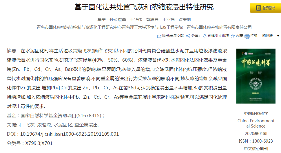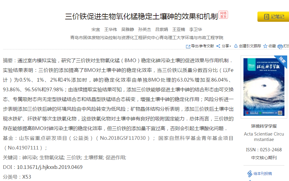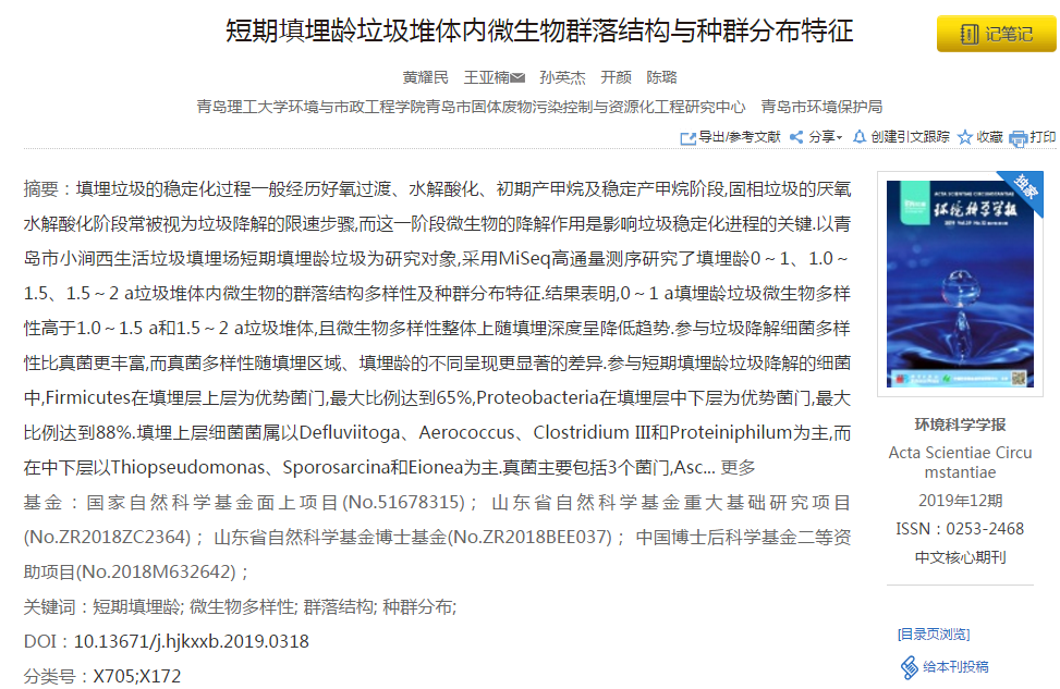 其中,车宁和吴娜在《中国环境科学》分别发表了题为《基于固化法共处置飞灰和浓缩液浸出特性研究》和《页岩气开采钻井固体废物的污染特性》的学术论文,黄耀民和宋宜在《环境科学学报》分别发表了题为《短期填埋龄垃圾堆体内微生物群落结构与种群分布特征》和《三价铁促进生物氧化锰稳定土壤砷的效果和机制》的学术论文。