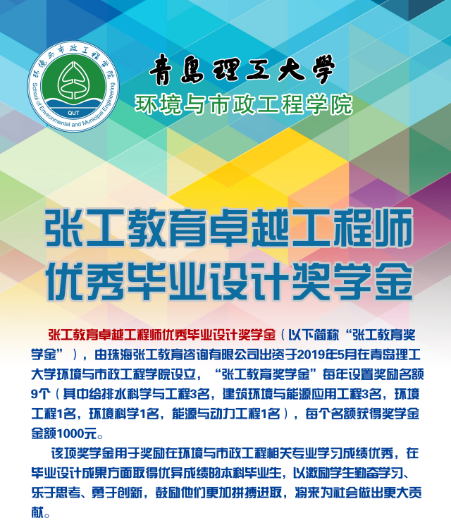 我校给排水83级校友张福先心系教育、情系母校,于2019年在青岛理工大学纽约国际上网导航设立“张工教育卓越工程师优秀毕业设计奖学金”,2019年共有9个毕业设计项目获得奖励,2020年又评出9个获奖优秀毕业设计,分别是给排水科学与工程专业3个:青岛市麦岛污水处理厂提标扩建工程设计(赵洋,毕学军教授指导)、青岛市黄岛区灵山卫排水区排水工程设计(孙文琳,苗群教授指导)、云南腾冲清水乡给排水规划设计(曹海燕,李金成副教授指导);建筑环境与能源应用工程专业3个:重庆某高校教学示范楼空调工程设计(孙德熙,季永明博士指导)、潍坊信圆金融服务中心1号楼空调工程设计(周腾德,崔红社副教授指导)、商丘城市广场空调设计(周思伟,刘国丹教授指导);环境工程专业的青岛某包装印刷厂废气中VOCs处理工艺设计(高燕,张宜升副教授指导),环境科学专业的多级A/O-MBBR工艺对微污染的去除研究(王慧敏,陈栋副教授指导),能源与动力工程专业的小型旋流燃烧器(航空用)的设计(李朝民,张敬奎副教授指导)。