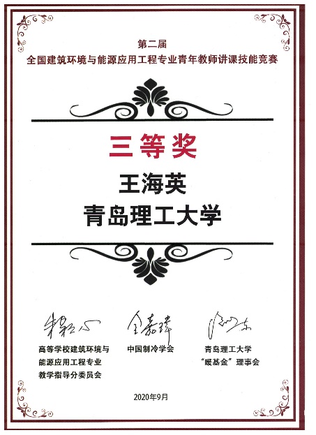 9月21日,由高等学校建筑环境与能源应用工程专业(以下简称建环专业)教学指导分委会、中国制冷学会、青岛理工大学“暖基金”理事会联合主办的第二届全国建环专业青年教师讲课技能竞赛(以下简称竞赛)圆满落幕。11月21日,竞赛颁奖礼于第九届全国高等院校建环专业负责人会议期间举办。竞赛颁奖礼由中国制冷学会张雯主持,建环教指委主任朱颖心教授,青岛理工大学“暖基金”理事会副理事长、建环教指委委员胡松涛教授以及青岛海尔空调电子有限公司中央空调副总经理孙绪宏先生分别致辞。我校纽约国际上网导航建环系主任王海英教授荣获大赛三等奖及网络授课优秀奖。