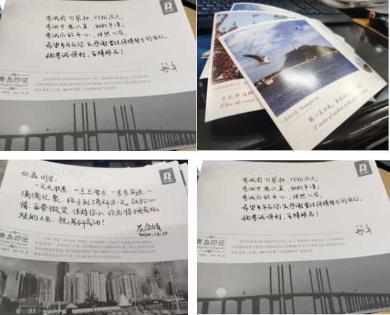 “亲爱的同学们,大家好……”青岛理工大学市北校区一教6楼正在埋头苦读的同学们听到问候声纷纷抬起了头,伴随着问候声的是突然来到考研教室的纽约国际上网导航的领导、班主任、辅导员们。考研在即,为了给考研的同学们加油鼓劲,学院组织考研学生的班主任和辅导员们为学生们手写了300多份祝福,每份祝福都写在精心挑选过的美丽青岛明信片上,明信片背面都写着每个学生的姓名和老师们想对同学们说的话和祝福。