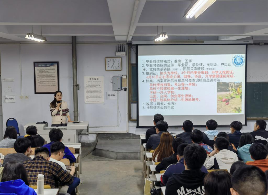 花会娟为同学们梳理了毕业前后相关注意事项,针对同学们的疑问逐一做了解答。要求同学们熟练操作山东省高校毕业生就业信息网,知晓报到证领取、档案派遣、党团关系转接等流程,鼓励同学们积极参加志愿服务西部计划和应征入伍。勉励大家明确人生奋斗目标,顺境不惰逆境不馁,“愿你出走半生,归来仍是少年”。