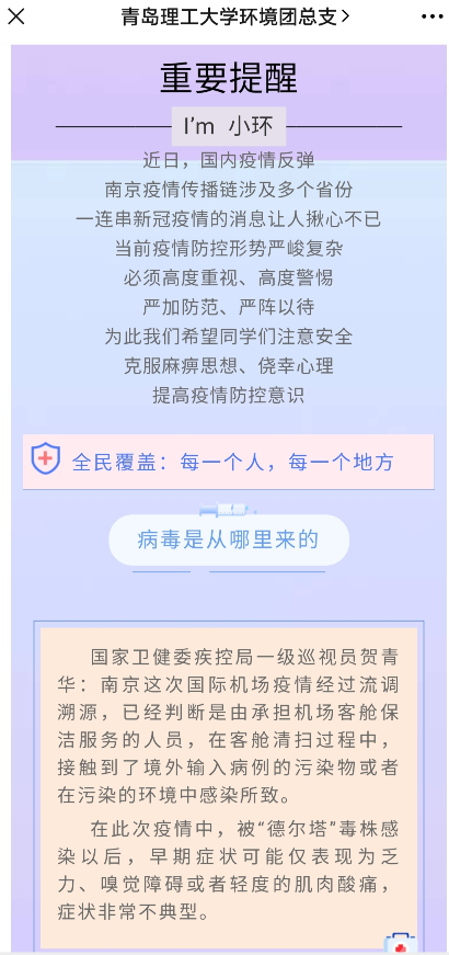用好线上宣传武器,提高学生的疫情防控意识。学院充分利用QQ号、微信公众号传播快、范围广的特点,在环境学院微信公众号、QQ小环学院宣传平台上及时转发、推送学校、学生处、学院关于新冠肺炎疫情防控措施,科普疫苗接种和防治传播知识,引导全院学生科学认识本次疫情的特殊性。做好线下宣传工作,紧盯在校学生安全,针对留校备战考研学生,辅导员在临时组建的班级召开疫情防控专题宣讲会,为在校学生普及防控知识,提醒大家在日常生活中要“勤洗手、常通风、戴口罩、”,做好“一米线”等个人安全防护;解读当前学校疫情防控要求,讲清楚疫情防控形势的严峻性,提高学生的自我防护意识。
