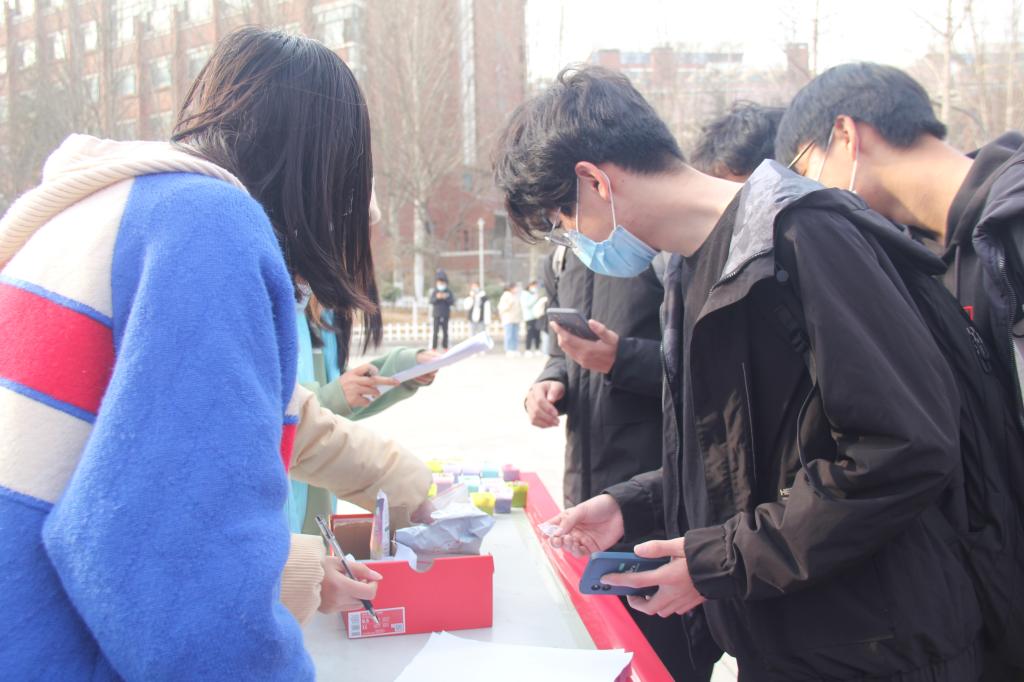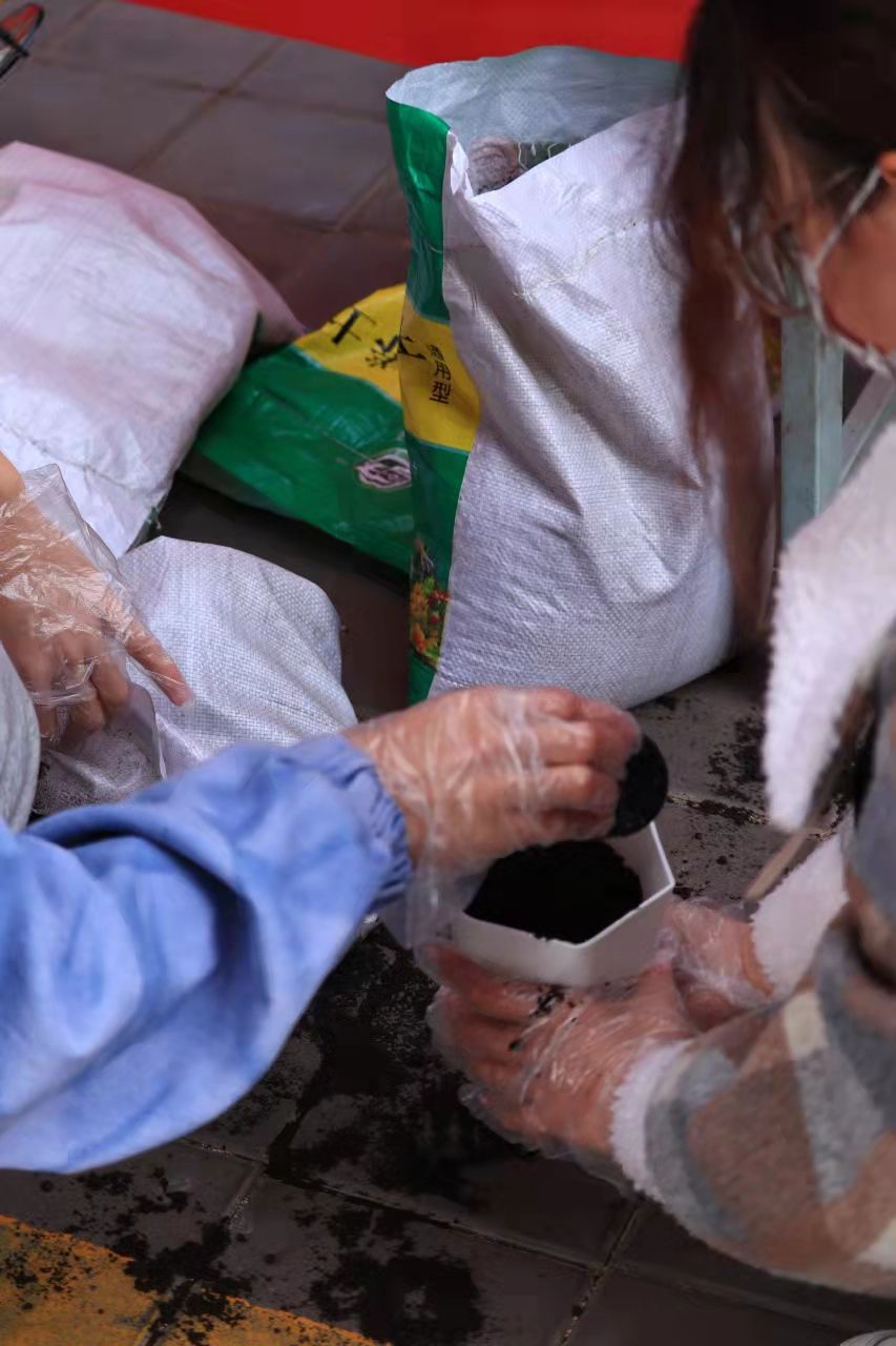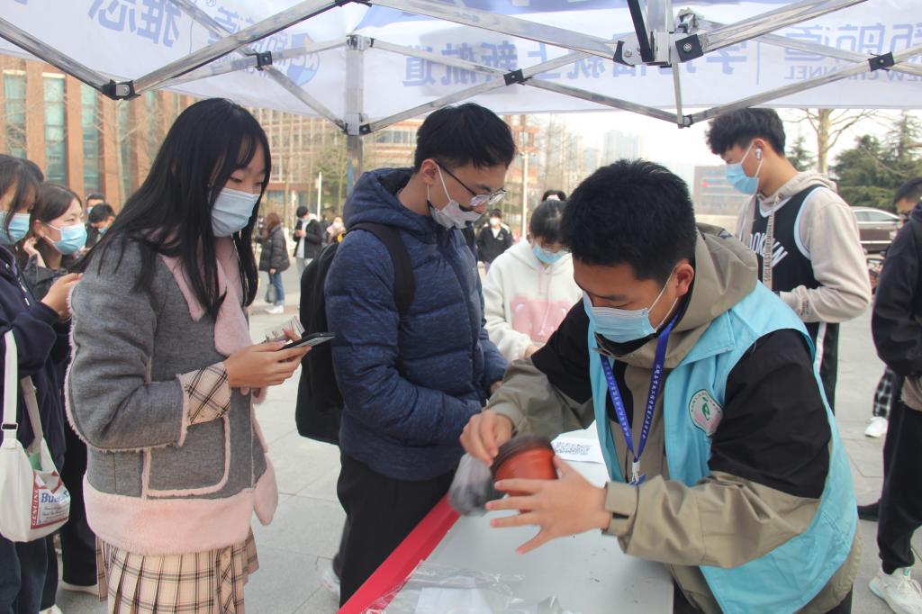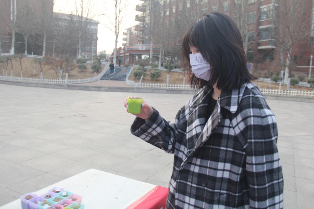 活动开始前,环保志愿者协会的成员们买种子、扫现场、搬桌子、运土壤、送绿植……并按照疫情防控的要求设置引导员,负责引导同学们保持一米以上安全距离。在东区公寓和西体育场的活动现场,同学们情绪高涨,陆续到达领取点并在引导员的帮助下领取绿植、种子以及土壤。在领取时,志愿者将种子递给同学们,并为同学们详细介绍了每种绿植的种植方法和注意事项,同学们也在现场互相分享自己之前培养绿植的经验:“不能浇太多水,要时常晒太阳但不能长时间暴晒……”点点建议宛若滴滴雨露,滋润着手中的绿植茁壮成长。