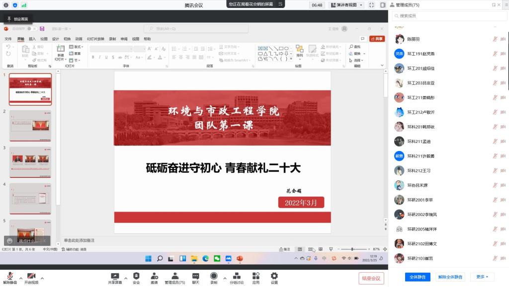 随后,学院本、硕、博、协会85个团支部分别召开了团队第一课,各支部融入学生喜闻乐见的时尚元素,策划开展了具有支部特色的主题课。给排水212团支部书记李孜璇用好《习近平和大学生朋友们》这一生动教材,结合习近平总书记对青少年学生群体的系列重要讲话、回信精神,感悟党对青年学生寄予的厚望和时代赋予的光荣使命。环境科学191团支部祁丽桦以科技创新竞赛为主题向同学们分享参赛经验。研2105团支部围绕智力“反”乡,硕博实践团助力家乡发展下一步工作进行了讨论。繁星志愿者协会结合近期疫情防控中的志愿服务工作,号召广大志愿者行动起来,以实际行动为疫情防控做贡献。