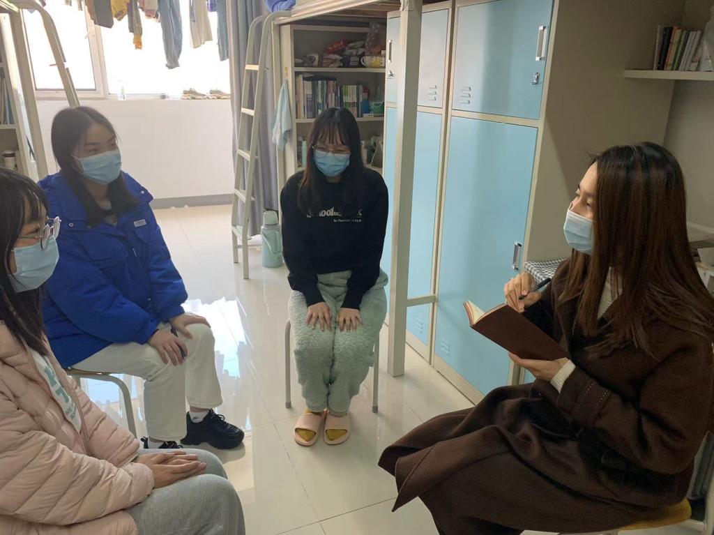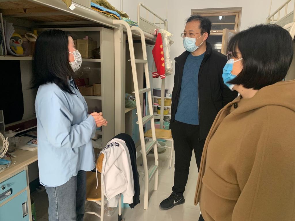主动敲门,聚焦学生所思所想。在校园封闭管理期间,学院党委书记马莉、副书记隋学智以及全体辅导员,坚持每日深入学生宿舍,走访宿舍493间,累计135小时。和学生“零距离”“面对面”接触交流,全面了解学生生活状态和思想动态,让思想政治工作更加贴近学生、贴切实际、贴近生活,实现大学生思想政治教育的润物无声。马莉谈到,疫情防控对同学们是一堂思政大课,“越是特殊时期,大家越要认识国家为确保人民群众生命安全和身体健康做出的努力,构建战疫命运共同体的青春担当”。隋学智对同学们提出,线上学习模式启动,同学们更要加强自我约束,自觉践行文明行为,养成良好学习生活习惯。