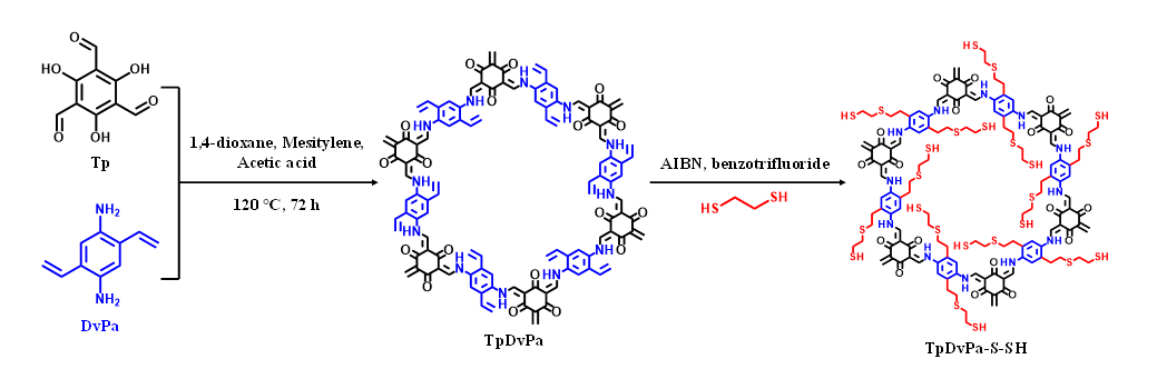图2. 新型巯基化COF材料 (TpDvPa-S-SH) 合成示意图