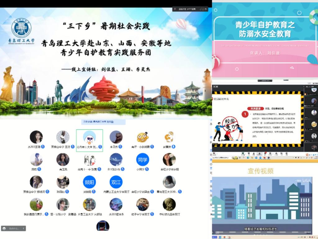为深入学习宣传习近平新时代中国特色社会主义思想,贯彻落实习近平总书记关于青年工作的重要指示,提高青少年的防护意识,为青少年的健康成长保驾护航,青岛理工大学赴山东、山西、安徽等地青少年自护教育实践服务团(团队成员:刘佳盈,王珊,翟李永,王沁琳,刘义斌,李灵杰;指导老师:赵方超;管理老师:王登榜)秉持着积极为青少年普及宣传自护教育的态度,以线上线下相结合的方式开展“防诈骗”,“防溺水”以及“防校园霸凌”三大主题的讲座。在线下,成员们进入当地小学,社区青少年中心以及农村里进行实地宣讲;在线上,则召集更多身边的青少年通过腾讯会议的方式展开宣讲。