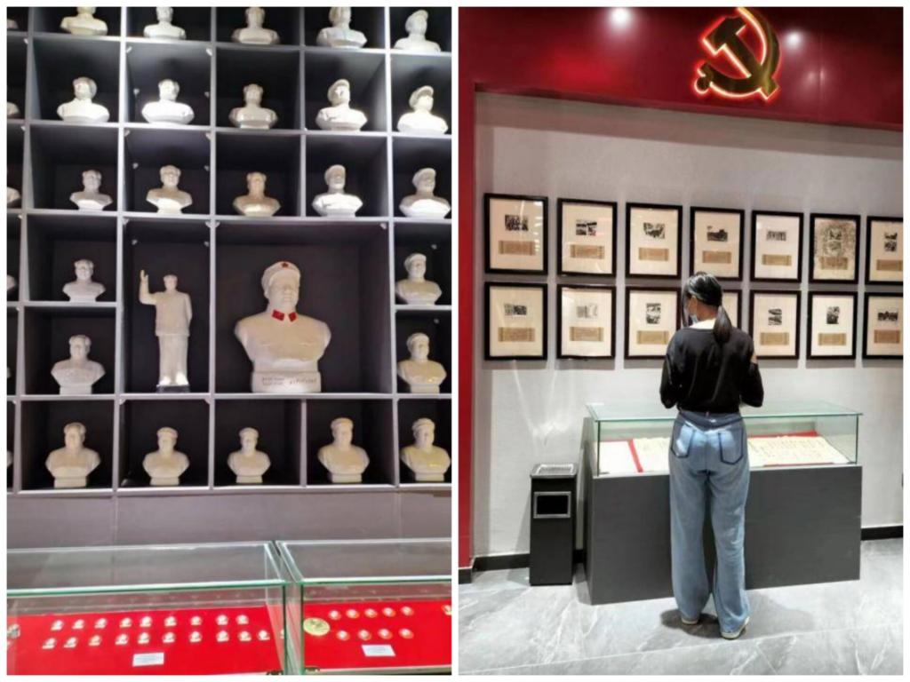 继续往前走,映入眼帘的便是不同时期毛泽东同志的雕塑和勋章,以及毛泽东创作的诗集。“红军不怕远征难,万水千山只等闲”,新中国成立前,毛泽东诗词在浓墨重彩地记录国内革命战争的同时,也诗意地表达了抵御外侮的强烈决心和对全人类命运的深切关注。“太平世界,环球同此凉热”,新中国成立后,毛泽东诗词的主题发生了重大变化,视野更加开阔,面向整个世界。成为抒发外交理想、表达外交立场、宣示外交政策的特殊文本。毛泽东曾指出:“人是要有一点精神的,无产阶级的革命精神就是由这里头出来的。”实践成员表示,当代大学生应学习青年毛泽东的学习观,使新时代青年明晰学习追求、拓宽学习视野、端正学习态度和改善学习方法,树立正确的世界观、人生观、价值观和奋斗观,成为有理想、有本领、有担当的新时代青年。