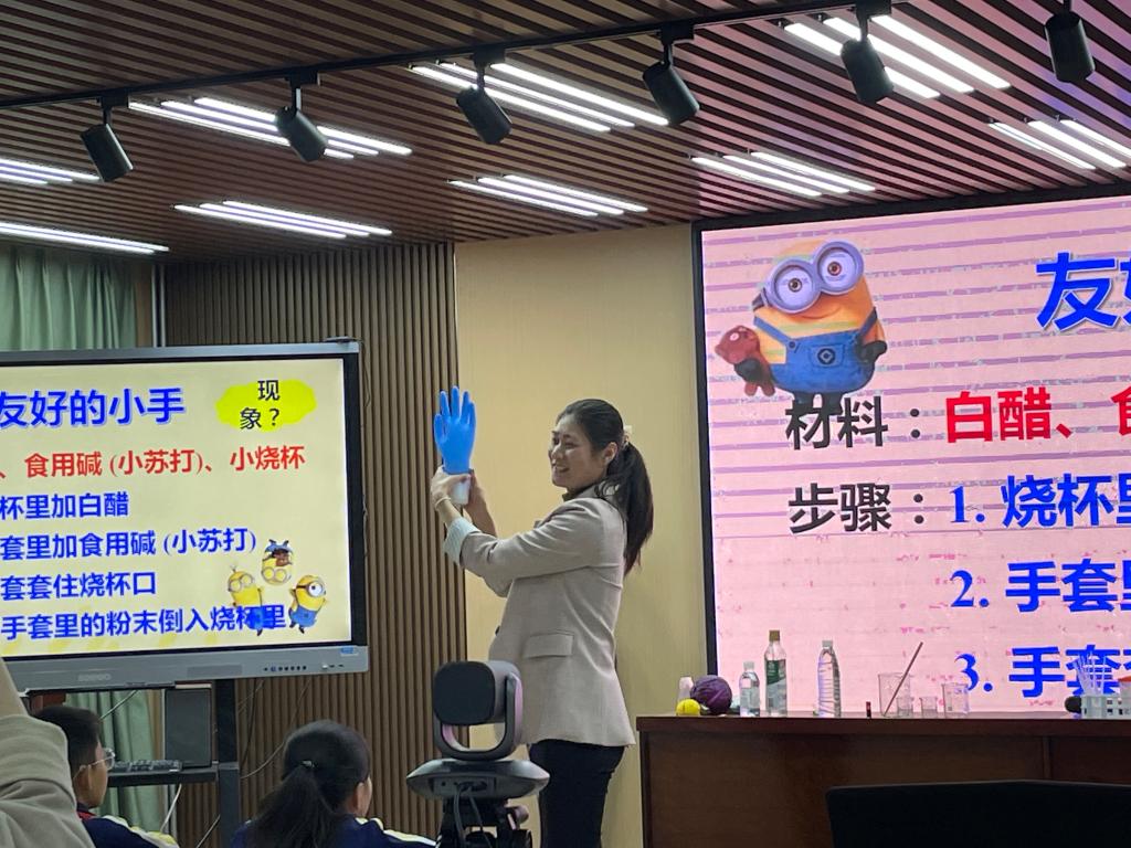 化学科普讲堂进小学的“当头炮”由吴令霞老师打响,她带来了《化学变色衍生的生活变色小实验》讲座。讲座的序幕由“友好的小手”实验拉开,实验直观地呈现了白醋与小苏打反应生成二氧化碳。吴老师把酸性的白醋滴入碱性的小苏打,给装置套上小气球,气体撑起“小手”状气球向同学们招手,欢迎同学们进入化学知识的殿堂。随后,吴老师将紫色石蕊试剂滴入两种反应物,分别变为了蓝色和红色,并邀请同学上台进行尝试。吴老师对其进行了原理讲解,并引申出生活中其他常见酸碱指示剂的制备方法、效果及原理,最后又回归到化学在生活中环保、医学等领域的应用。在答疑环节,同学们纷纷踊跃提问,吴老师也一一进行耐心解答。“吴老师好厉害,我也想学习做化学实验,成为像吴老师那样的‘魔法师’!”东胜路小学六年级一班的张同学对吴老师的化学小课堂赞不绝口。