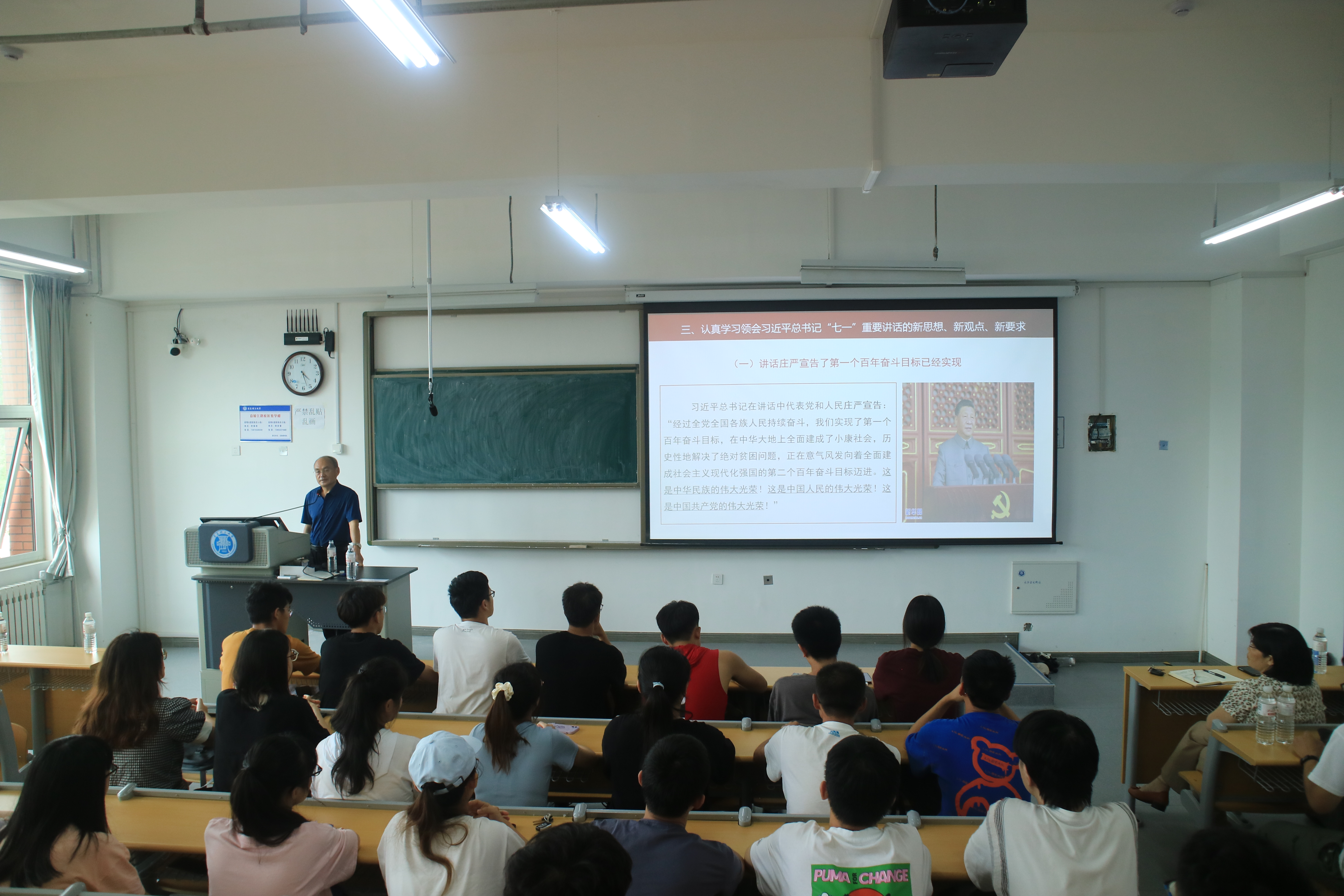 李长河以“百年辉煌路 奋进正当时——学习宣传贯彻习近平总书记‘七一’重要讲话精神”为主题,为同学们上了一堂深入浅出的党课。从准确把握习近平总书记“七一”重要讲话的重要意义;认真学习习近平总书记“七一”重要讲话蕴含的百年党史中的数字密码;深刻领会习近平总书记“七一”重要讲话的新思想、新观点、新要求;在学懂弄通做实上下功夫,做勇于担当民族复兴大任的新时代大学生四个方面来讲述新时代大学生应该如何学习贯彻习近平总书记的“七一”重要讲话精神。